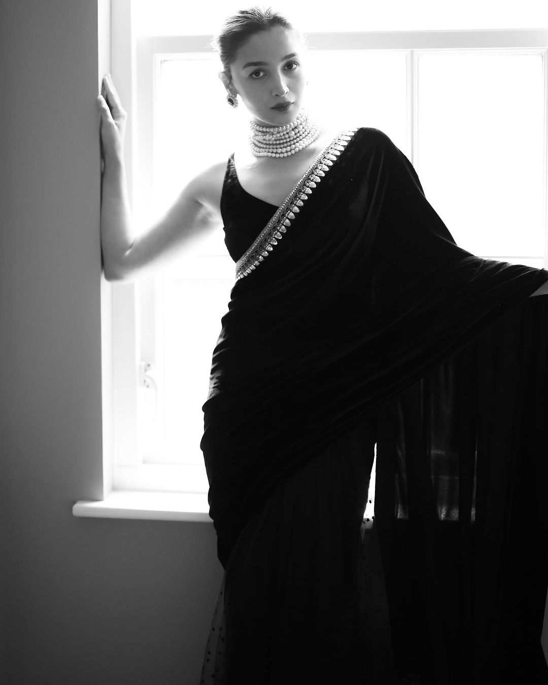 Recently, at the prestigious Poacher screening in London, Alia Bhatt transported us to a bygone era with her breathtaking ensemble and timeless beauty. Dressed in a mesmerizing black velvet saree and adorned with exquisite pearl jewelry, Alia epitomized the essence of retro chic, effortlessly blending classic sophistication with modern allure. Join us as we delve deeper into the enchanting world of Alia's retro-inspired look, from the intricate details of her saree ensemble to the graceful adornments and vintage-inspired hairstyle and makeup that captured hearts and minds alike. The last time we caught a glimpse of Alia in a luxurious velvet outfit was at the Rocky Aur Rani Success Meet, where she adorned a pink saree.