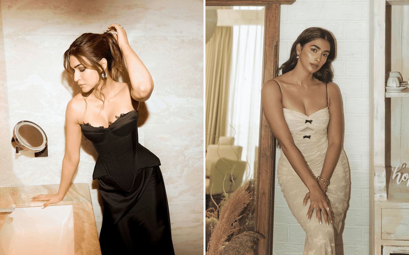While Kriti’s structured corset gown focuses attention on her waist and upper body, Pooja’s bodycon dress effortlessly follows the curve of her hips and lower back, making her look like a goddess sculpted by the hands of desire itself.